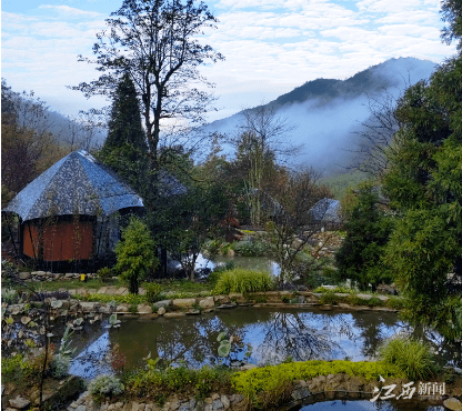 在萍乡市武功山景区海拔1000米左右的位置上,高端拼装式木屋依山而建,错落有致,返璞归真的游客接待中心、天然的户外浴池映入眼帘。
