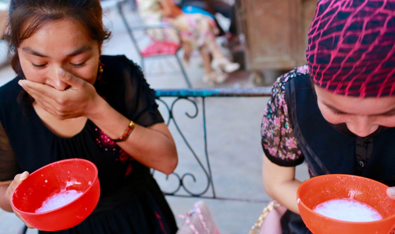 这是新疆女子喜爱的莎朗度,据说是用冬天水库的冰跟酸奶和蜂蜜晃来晃去喝的美味,但是这莎朗度却常备女子用在夏天喝,没冰是不可能的,好多女子都会在冬天取一些冻起来,夏天用,这样的美食你们见过吗?
