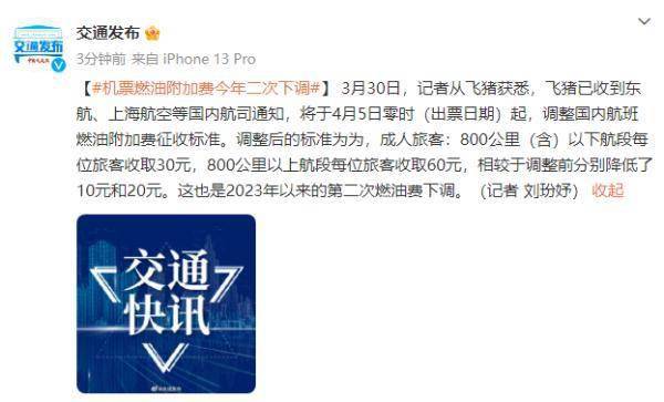 据“中国交通报”微博消息,4月5日零时(出票日期)起,国内航班燃油附加费征收标准将再次调整,迎来今年第二次下调。