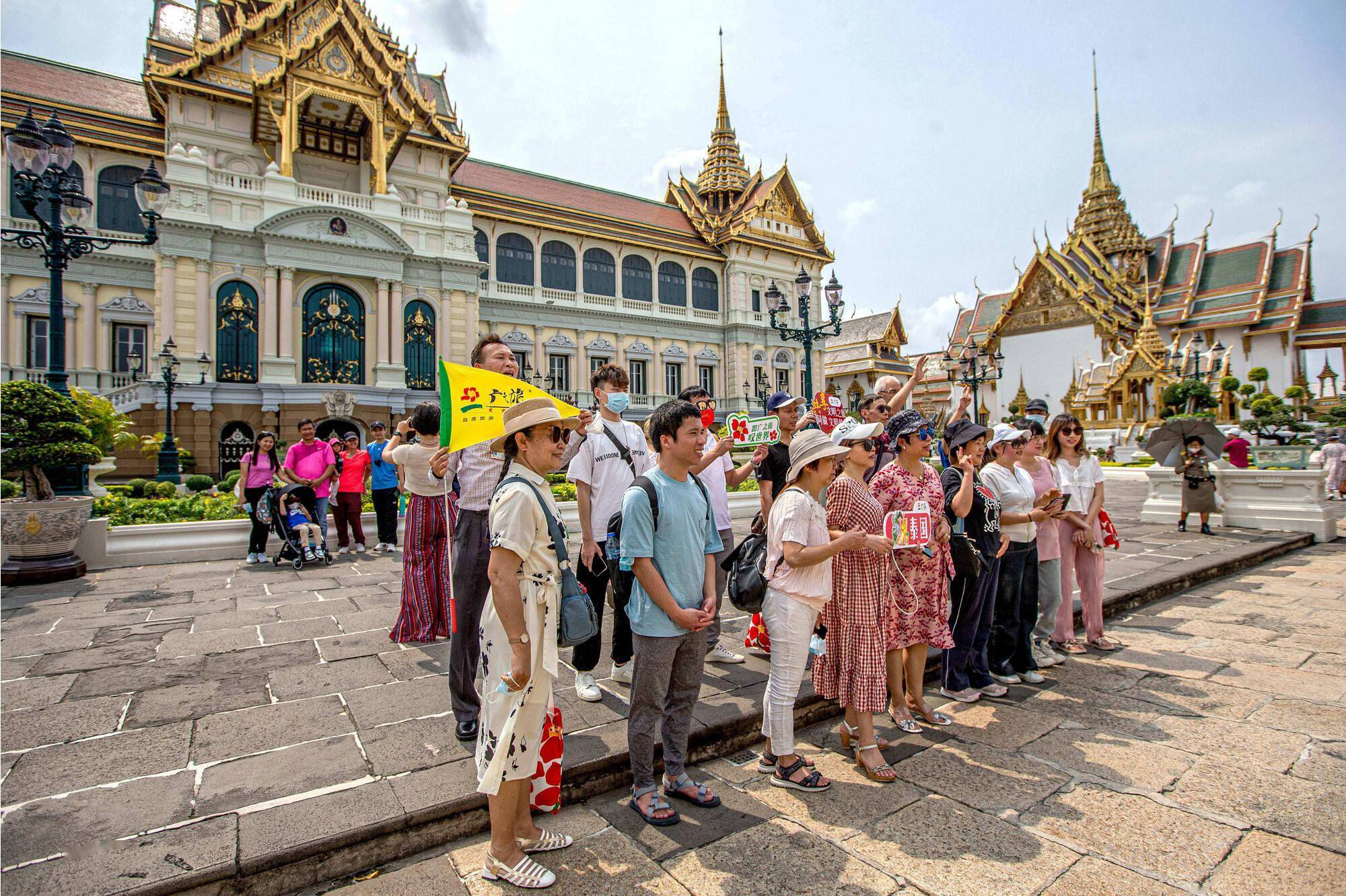 资料图 中国旅游团游客在泰国曼谷大王宫景区合影。新华社发
