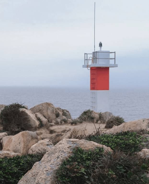 我们好不容易到达了土路的尽头只看到一块停车坪,旁边是围挡,根本没看到 灯塔 ,一度以为自己走错路了。需要从围挡钻过去,看到一处灌木缺口,顺着附近被踩出的道路,向海边走去,翻过一个小坡就能看见 灯塔 了,从远处看 灯塔 小小的一个。小心翼翼的走近看,红白相间的 灯塔 ,成片的海,毫无保留的海, 灯塔 矗立在海边悬崖之上,鲜亮且耀眼。