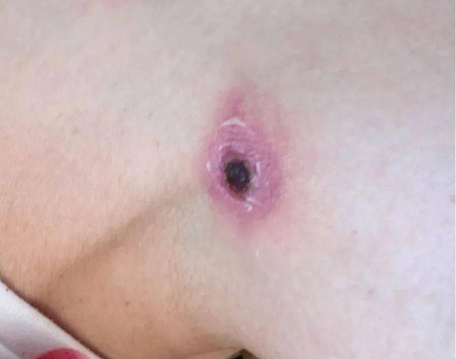 出现焦痂是确诊恙虫病的主要临床特征之一,焦痂通常位于腹股沟、腋窝、胸部、下背部和臀部。恙虫叮咬处往往先出现红色、无痛的小皮疹,皮疹逐渐形成水泡,一周左右后会自行破溃,出现坏死、出血,并形成形态相对较圆的深黑色焦痂。而一般斑疹、丘疹或咬痕往往呈淡粉色且不会自行破溃,这也是恙虫病焦痂与其它类似表皮症状的主要区别。