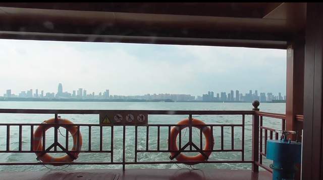 相比较于轮渡的那种大船,东湖游船的尾舱也能观赏景致,但面积有限。木质围栏,近在咫尺的湖面,螺旋桨带起的浪花,声音还不小。以湖面为参照物,轮船的速度很慢,而不远处的城市轮廓似乎静止了,坐在船尾,吹着微风,蓦然想起古诗,写到“画船听雨眠”的意境,与现在的环境有异曲同工之妙。而在东湖景区里,相关主题的诗词琳琅满目,游船行走,飘然而去。