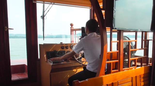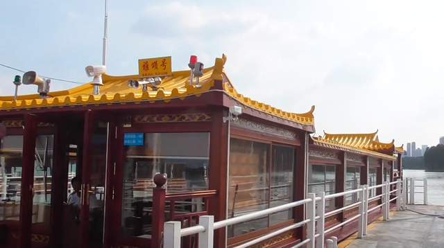 从岸边上到游船,看到游船的面貌、状态同样是古朴的风格,尤其木质结构非常突出。游船代号雅颂,体积不大,但显得极为精致,黄色与红色的主题色充满贵族气质。细看之下,雅颂号的很多设计其实已经没有古典元素了,比如船顶加装了喇叭、警示灯、天线,船舷有金属栏杆,还有面积巨大的玻璃落地窗。上到甲板进入船舱,里面的空间也不大,游客来回走动,船身轻微摇晃,比在城区体验的轮渡要差很多,轮渡那是妥妥大船。
