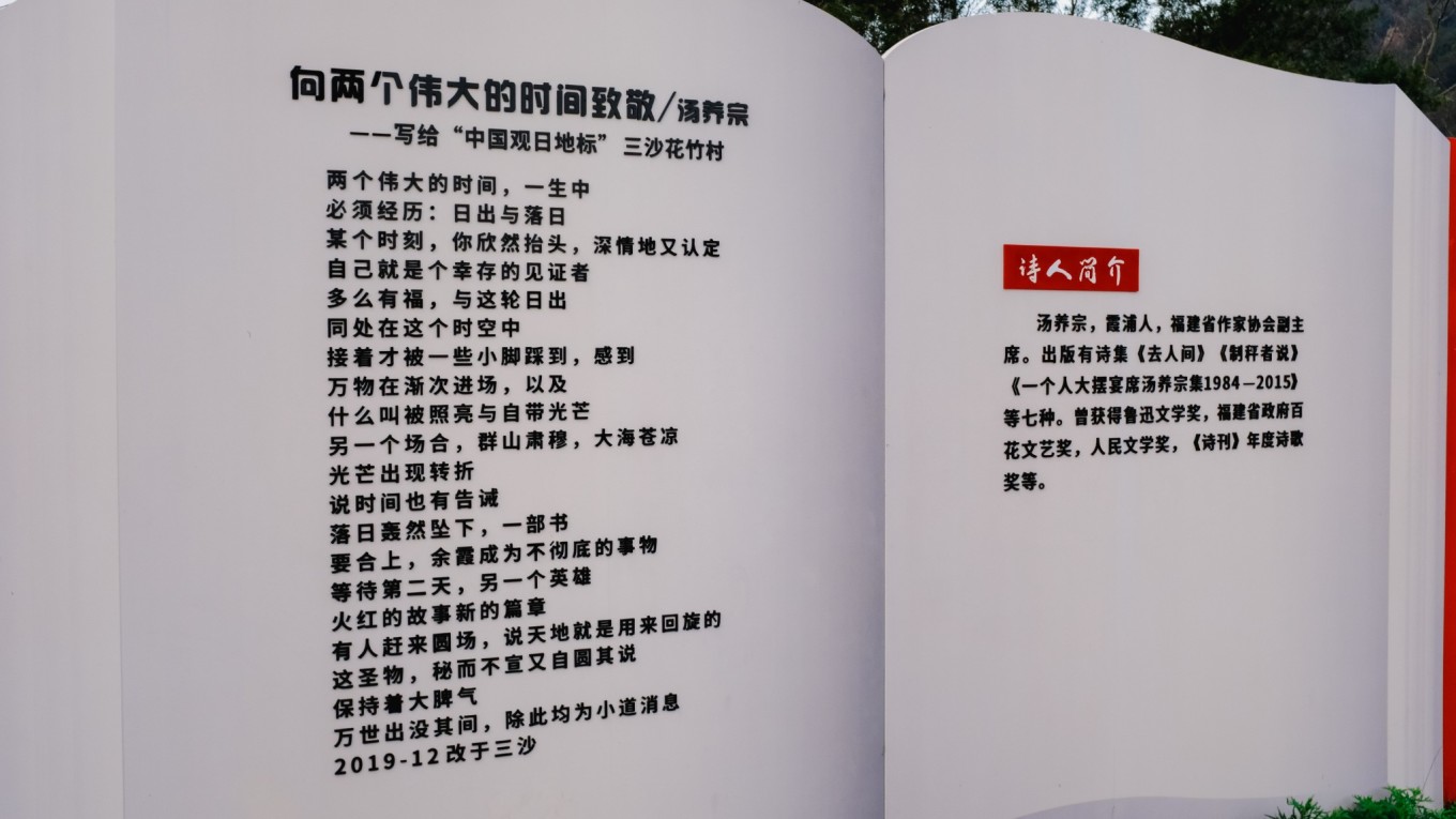 汤养宗还为三沙花竹村写了一首诗《向两个伟大的时间致敬》。