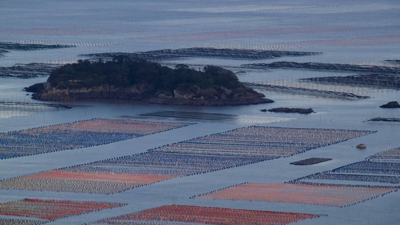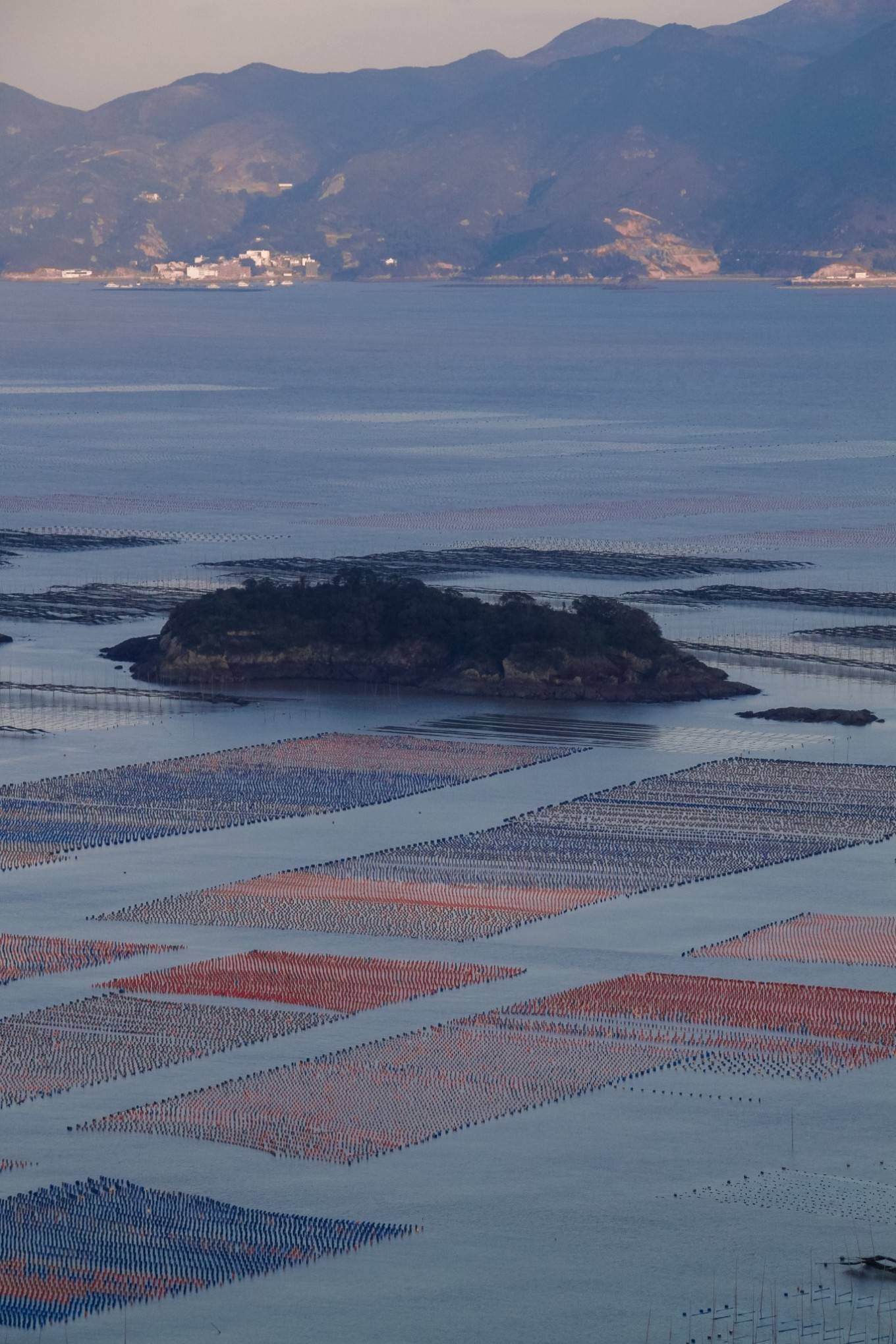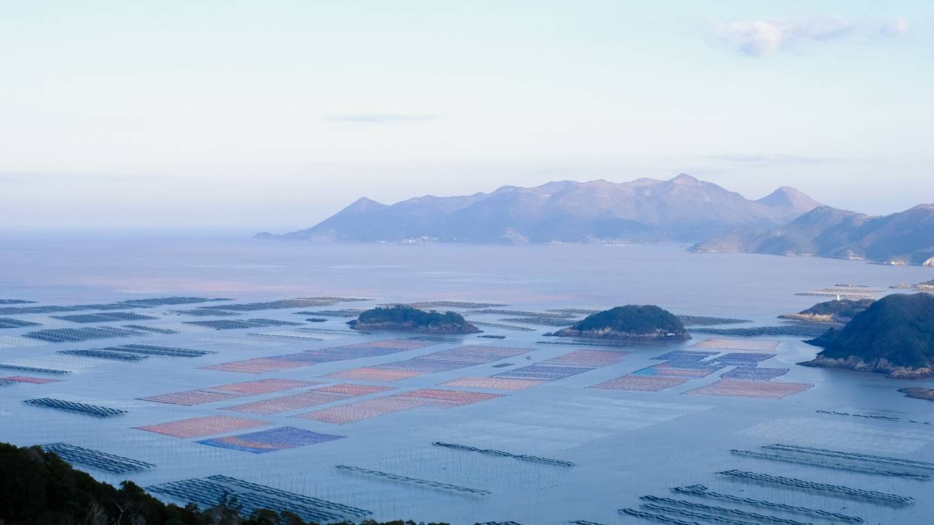 海面左边是密密麻麻的网架,像一块块补丁一样拼接着大海,一直延伸到天际线,是为壮观!