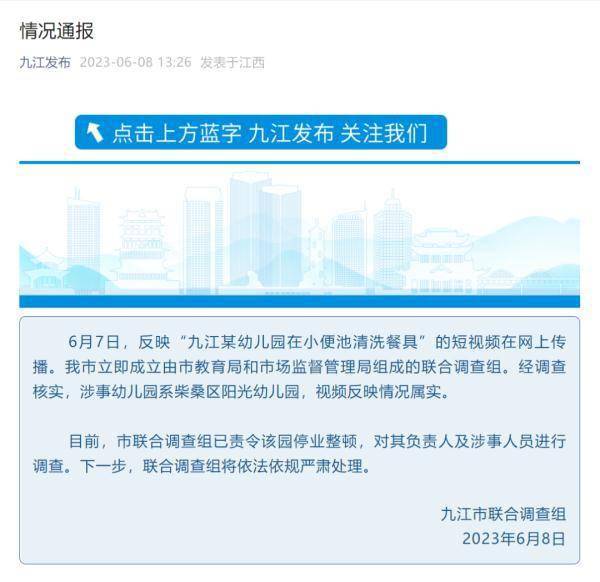6月7日,反映“九江某幼儿园在小便池清洗餐具”的短视频在网上传播。我市立即成立由市教育局和市场监督管理局组成的联合调查组。经调查核实,涉事幼儿园系柴桑区阳光幼儿园,视频反映情况属实。