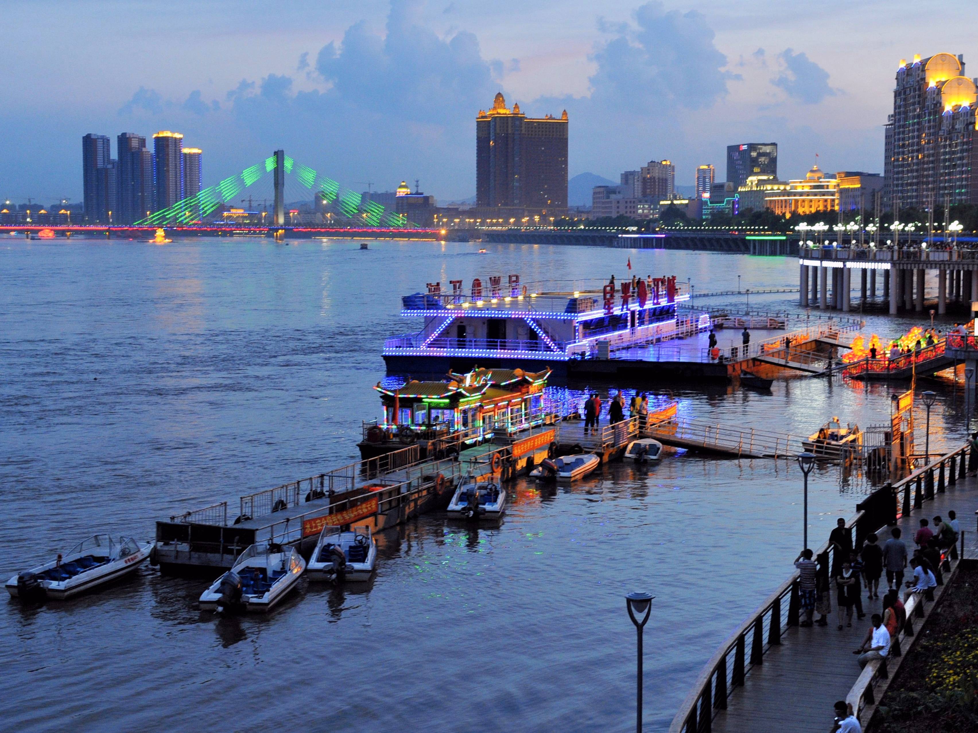 夕阳缓缓西下,余晖映衬在松花江上。华灯初上,游船在松花江上激起一道水纹,江畔的灯光开始慢慢跳动。