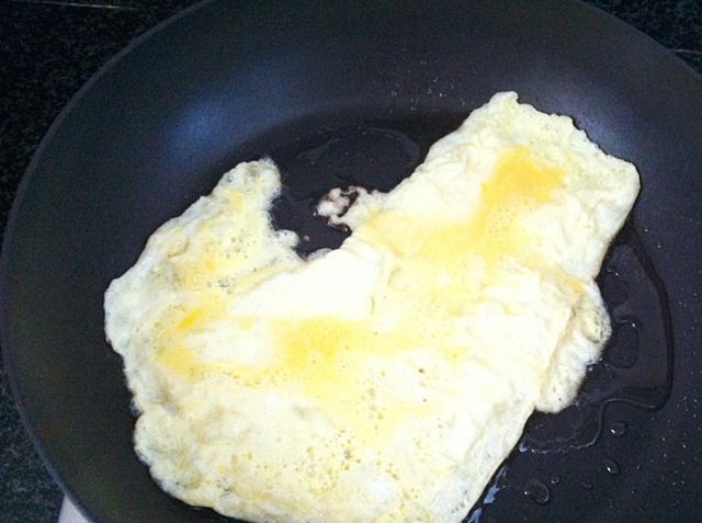 煮汤的过程中煎鸡蛋:热油、倒下蛋液煎成蛋皮,夹起切丝