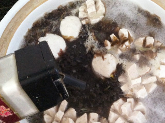 砂锅倒进4碗清水,肉丸和姜丝放进砂锅内煮开