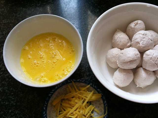 生姜去皮、洗净切丝,鸡蛋划散、肉丸洗净切刀花