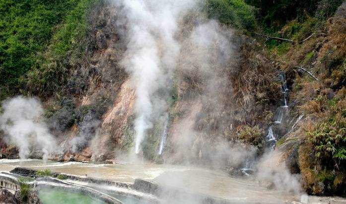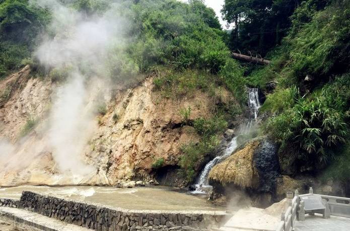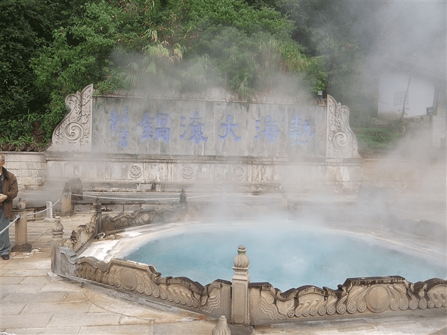 据介绍,“热海”一词得名于明代地理学家徐霞客对热海的地热景观做过详尽而精彩的描述,“一泓热海”是古代“腾越十二景”之一,热海因此得名。走进热海,果然名不虚传,到处热气腾腾,仿佛走进烟雾飘渺的仙境。当然最壮观的就是“大滚锅”了,这里是热海的核心景点。据介绍大滚锅形如八卦,池宽约10平方米,深约1.5米,水温最高可达97℃。走近大滚锅,可以看到池内的水急剧翻动,就像一锅沸腾的开水。只需要看看当地人把玉米、鸡蛋、花生放入锅边石槽内蒸煮食用,足于说明大滚锅的热能量有多大,温度有多高了。其他食物也是立等可取,别有风味。