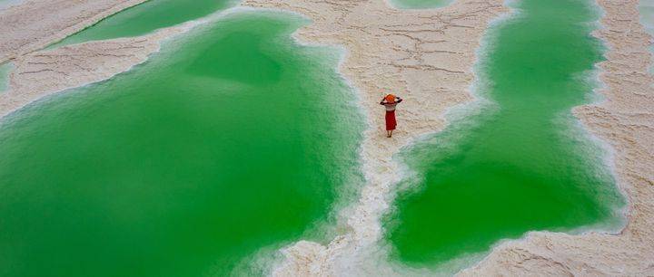 茫崖翡翠湖是现在热门的自驾游打卡地。翡翠湖是一个人工盐湖,由多年盐湖开采而形成的采坑,由于其所含矿物质浓度的不同,形成了颜色多彩的景象。