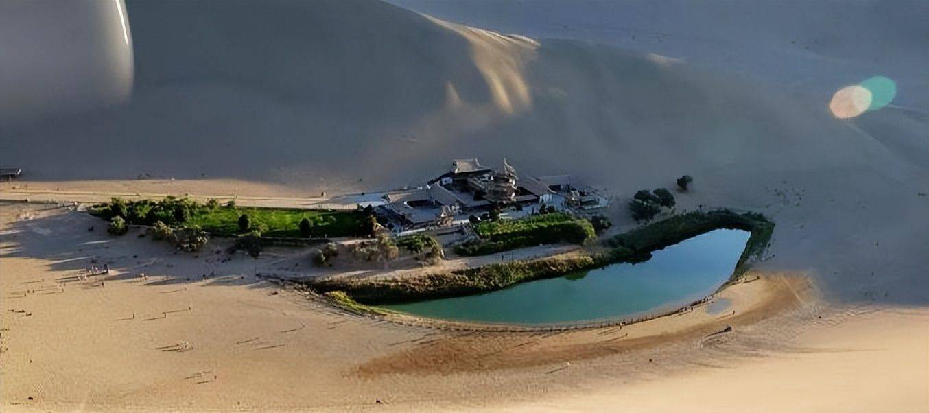而沙山之中的那一片弯弯的绿洲月牙泉,即使斗转星移、风啸沙鸣,依然碧水粼粼,宛若明镜,成就了“沙漠第一泉”这一闻名世界的奇观。