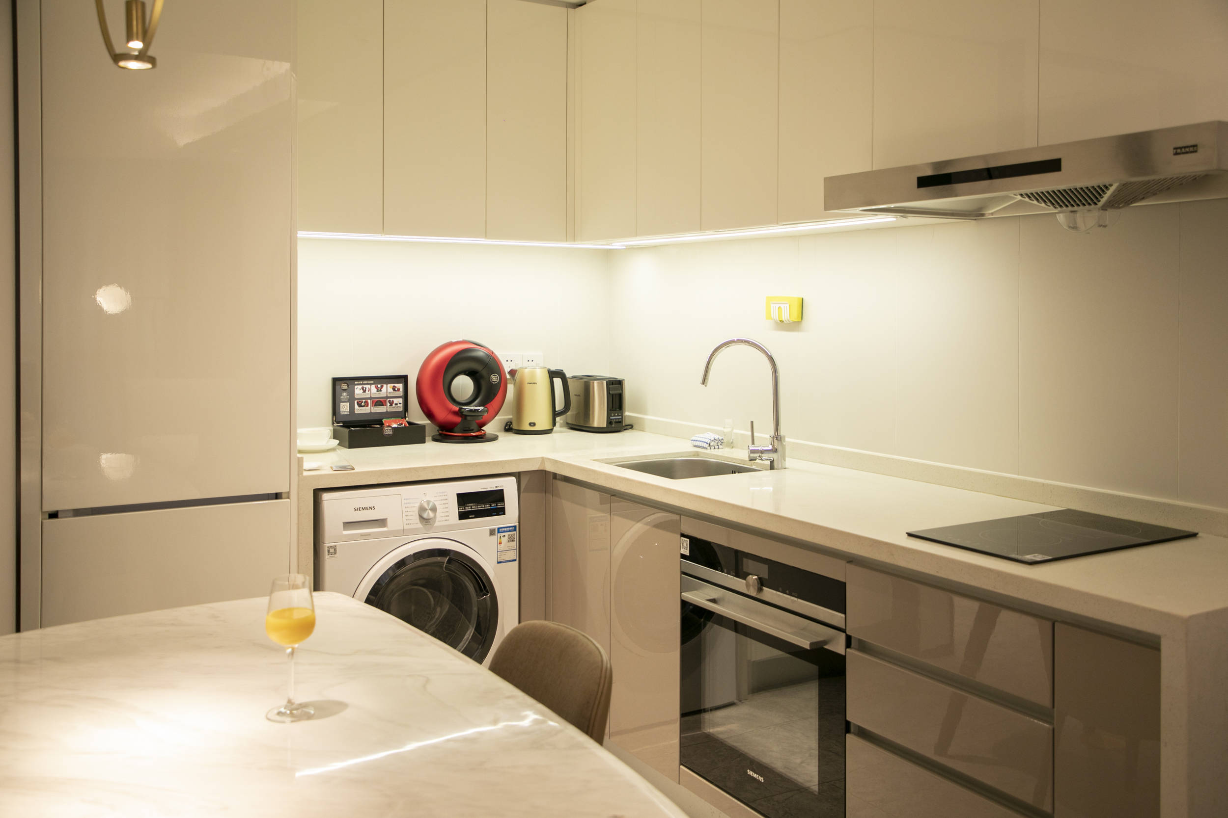 我入住的单人套房,有独立的客厅、餐厅、卫浴干湿分离。还有设施齐全的厨房,冰箱、洗衣机、咖啡机、热水壶等一应俱全。