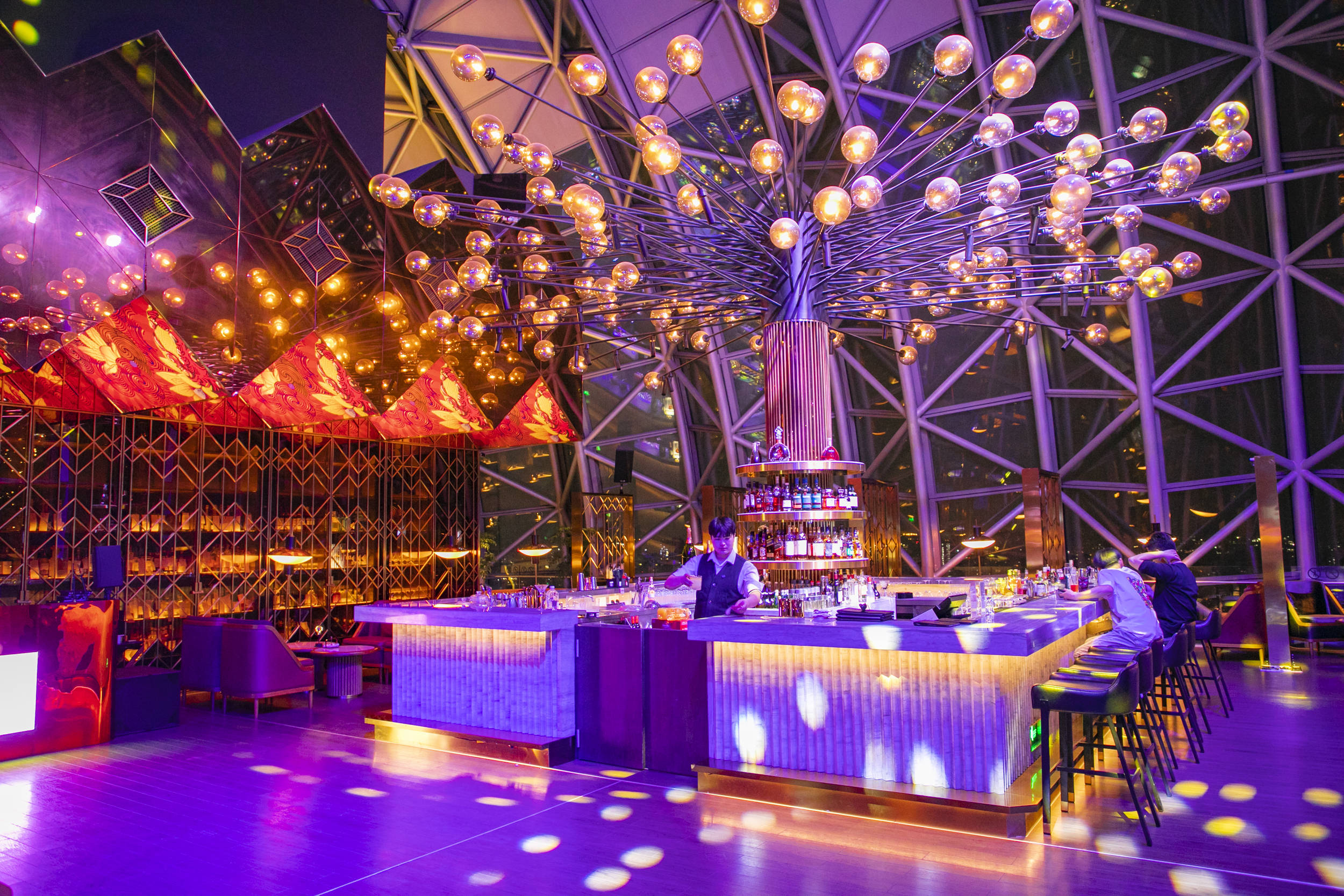 晚上可以去来福士250米高空的“水晶连廊·shua吧”,这里是重庆少有的极具赛博朋克风的高空酒吧,它拥有一面半圆悬空的观景台,这在重庆也是仅此一家。