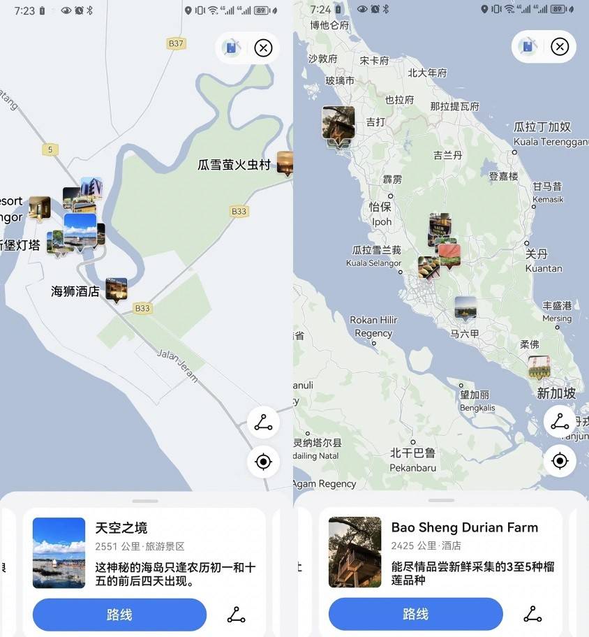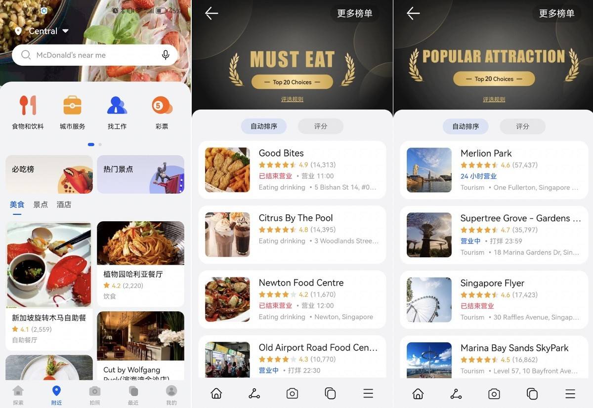 除了便捷、精准的导航体验外,Petal Maps还能根据当前位置,自动推荐附近的酒店、餐厅、景区门票等信息,用户只需下拉详情页,点击即可跳转至对应应用进行预定。在马来西亚地区,用户还可以轻松查询本地TOP榜单、旅行指南等信息,轻松搞定旅行规划。