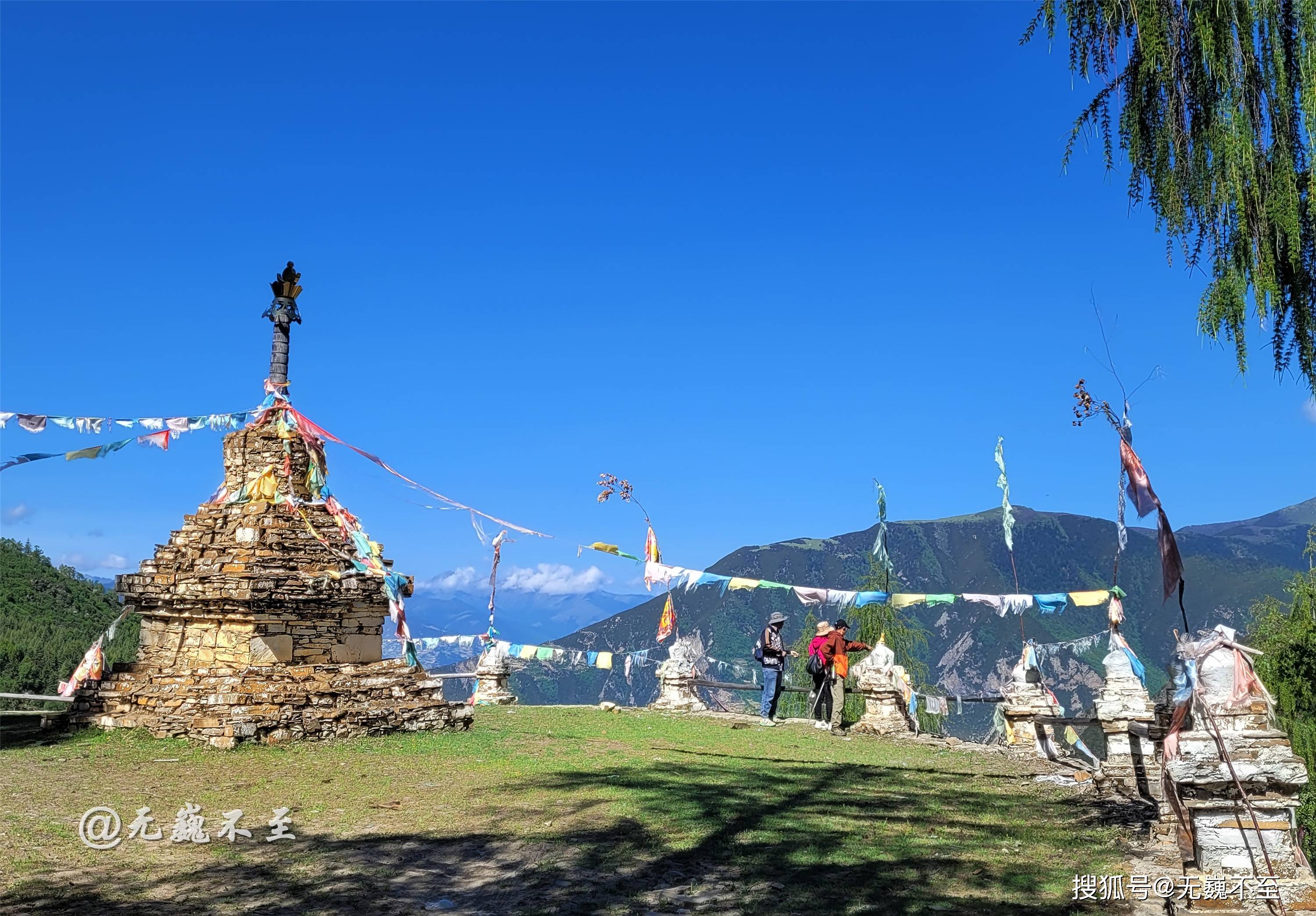 钻出密林,重返人间,踏上一条土路来到半山观景台,这里视野开阔,有一座不知建于何时、挂满经幡的古老白塔。