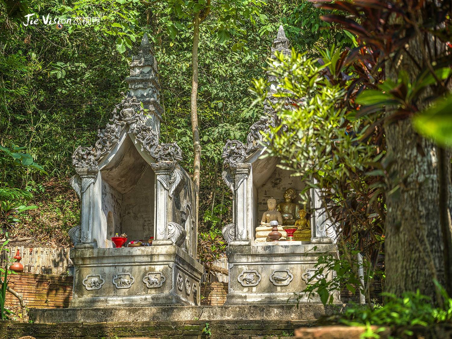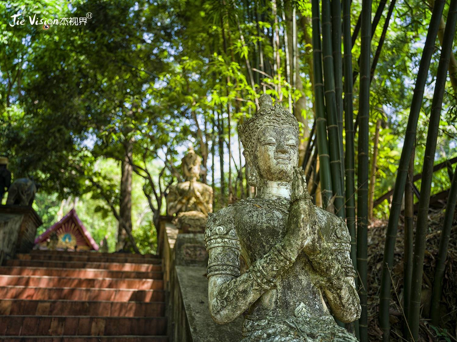步入啪啦寺大门,一条石阶通向寺庙深处,石阶两侧长满了各式植物,各种佛像和塑像隐藏在竹林和花卉中,佛像在花卉的映衬下显得娇美,而花卉植物在佛像的衬托下,则多了一份威严。