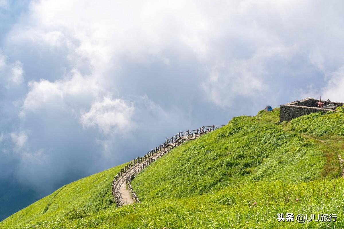 从景区的游客中心抵达山顶需要乘坐两级索道,从石鼓寺广场乘坐1级索道可抵达紫极宫。从这里开始可以选择徒步上山顶或是乘坐2级索道上山顶。出索道站之后,跟随指示牌行进,一路上全是万亩高山草甸,一副绿野仙踪的模样。山上的草甸长到膝盖的位置,在夏风的吹拂下,漫山遍野的绿草像是柔顺的长毛随风摆荡。乘坐2级索道,往福星栈道方向行进即可。