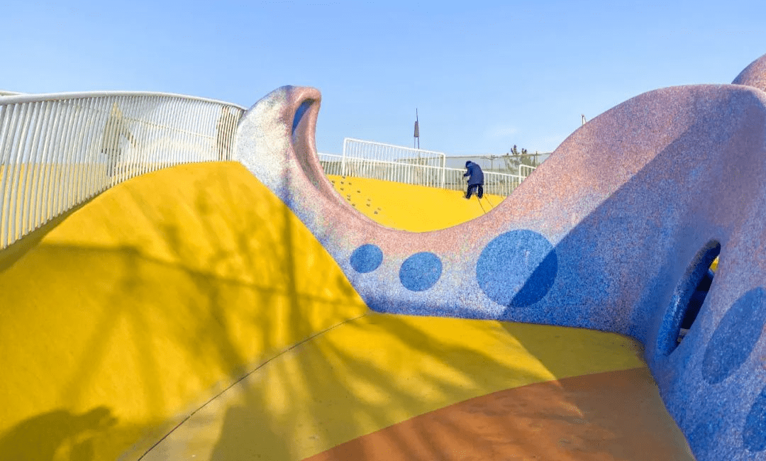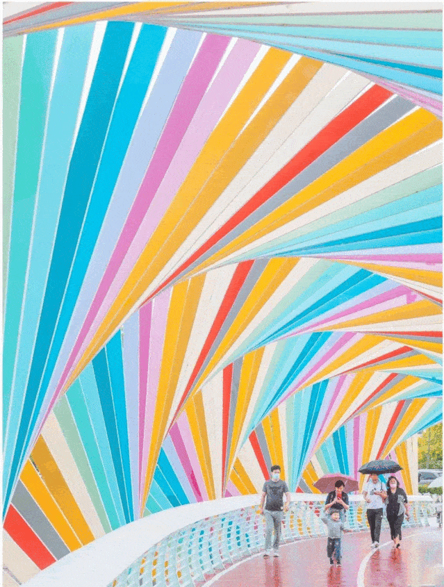 桥身曲折连绵,犹如一个巨大的万花筒,造型设计新颖独特,糖果色的Ins风,色彩缤纷。在桥上走一走,连心情都变得明媚起来。