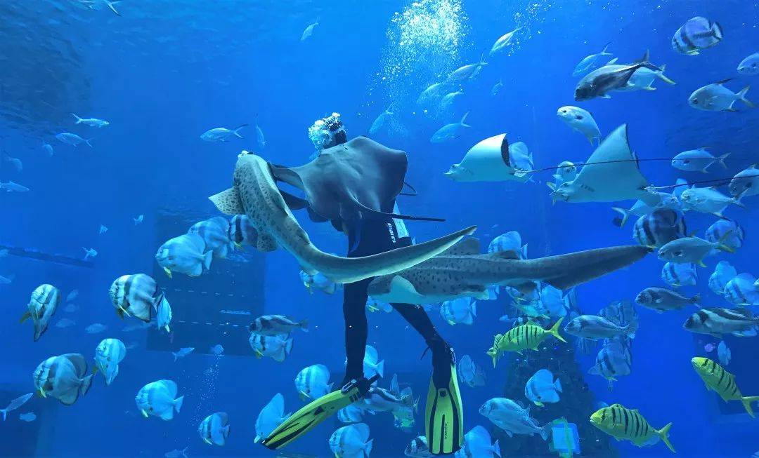 在“海底世界”,看人鱼表演,体验潜水。有机会的话,还可以一跃跳进这星辰大海,来这里撒个欢,夜宿海底,与鱼共眠。