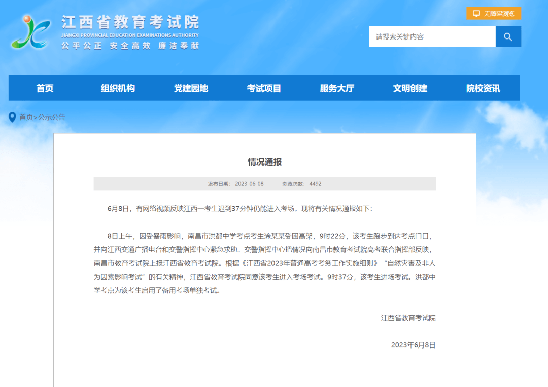 6月8日,有网络视频反映江西一考生迟到37分钟仍能进入考场。现将有关情况通报如下: