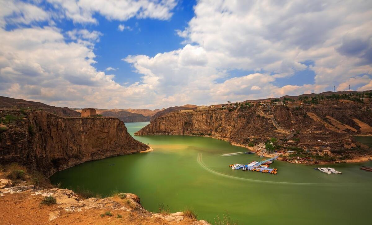 四、老牛湾黄河大峡谷旅游区,位于山西省和内蒙古交界处,这片奇伟土地地质遗迹类型丰富,自然景观独特,人文历史悠久,生态环境优美,峡谷两岸壁立万仞,河道中碧波万顷,河岸上长城耸立,村落中古迹遍布。这里是长城,黄河唯一交汇之处,拥有极高的历史文化内涵,同时也是黄土文化,黄河文化和窑洞文化汇融一体的特色地质景区。明代护水楼的雄姿,清代伏龙寺的袅袅香火,留存至今的秀才院落,古色古韵,立体展现了2000年黄河古文化。景区水上乐园也是一大亮点,不仅趣味性十足,还能从不同角度欣赏旅游区风光,神牛乐园设施齐全,包含旋转木马,迷你穿梭,观光小火车等等很多项目等你来探索。