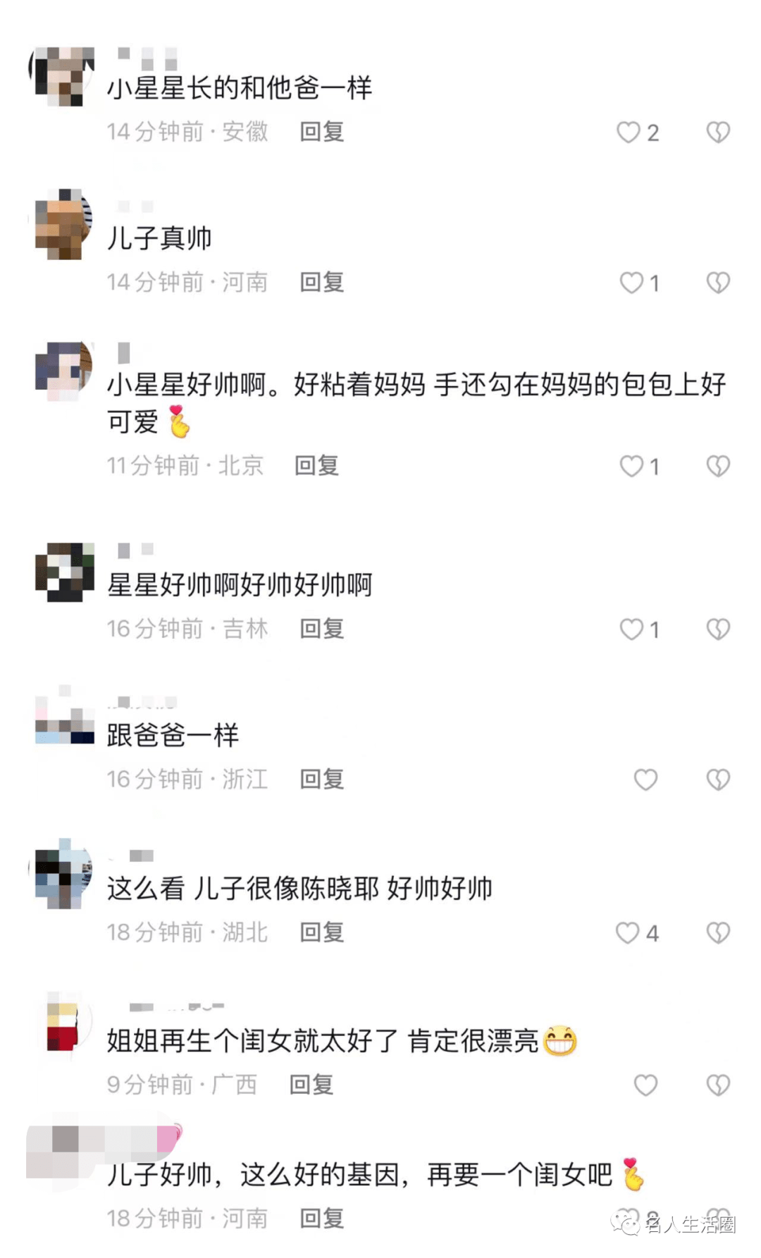 照片曝光后,网友们也惊叹不已,纷纷感叹小星星好帅气,和爸爸长得太像了,也因此有不少人开始催生,觉得陈妍希和陈晓这么好的基因不能浪费了,应该再生一个闺女,肯定很漂亮。