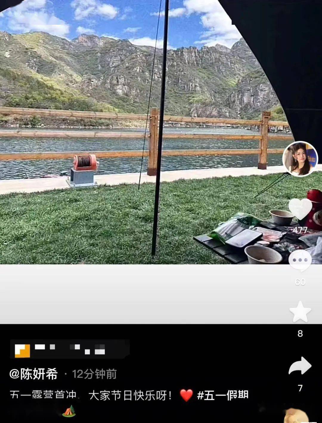 5月1日,陈妍希晒出一组美照,分享自己带儿子和闺蜜在山里露营的画面,引发热议。