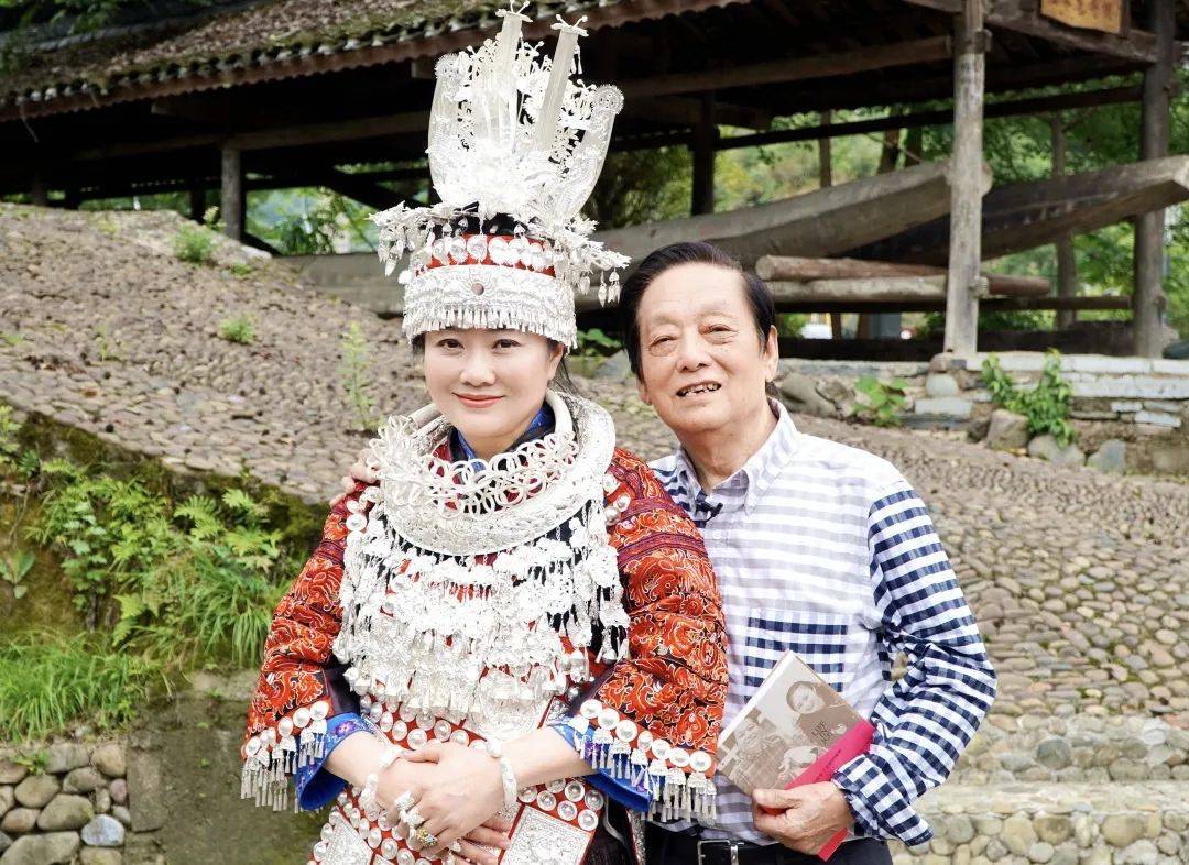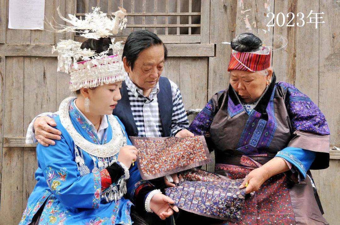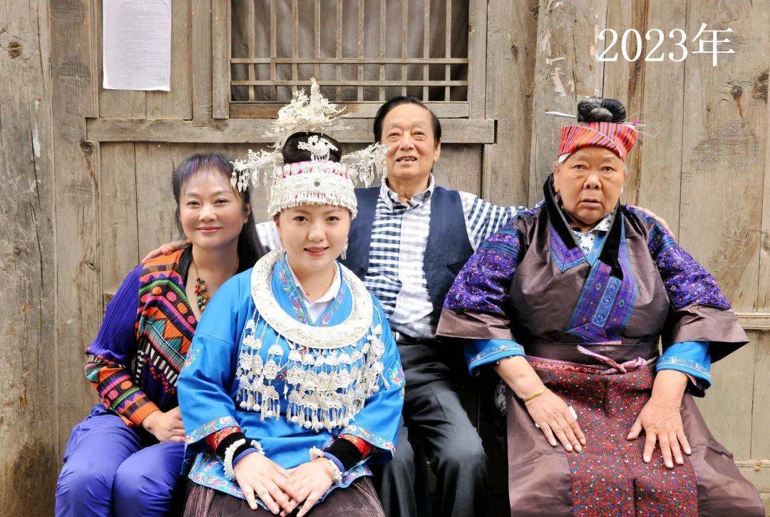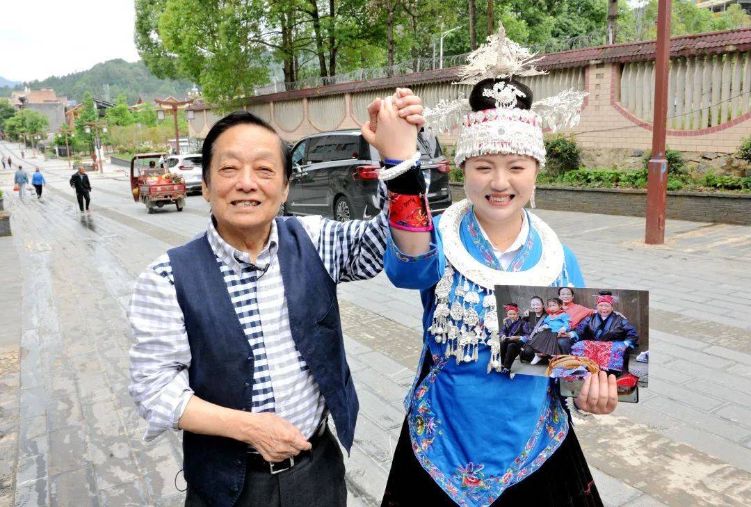 走出刺绣集市,路过窄巷去乘车的韩美林,在一处老寨子前,面对一位苗族老奶奶站住了脚步。“老奶奶,你对我还有印象吗?20年前我就在这儿跟你拍过照,问你买过绣品,讨教过纹样。”旁边一位苗族盛装少女拿出一张20年前的老照片,用苗语边指边跟老奶奶说:“阿奶,能认出来这是五岁的我,这是你吧。旁边的就是韩老师和周老师,她们专程来看你了。”