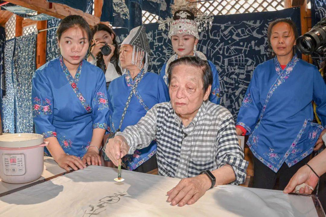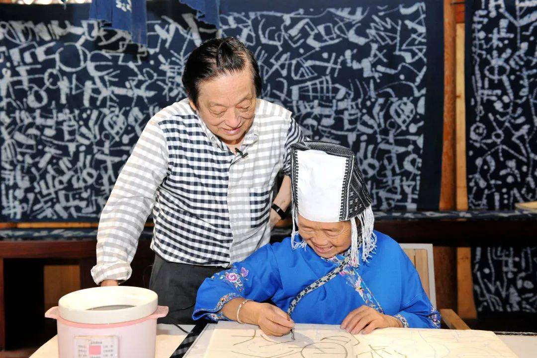 ▲韩美林看着制作中的苗族蜡染,赞叹不已