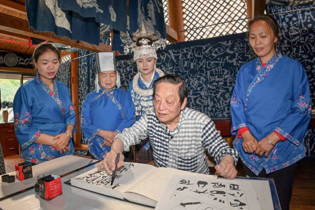 他与蜡染和刺绣手工艺人畅谈这20年,贵州民间艺术的发展。说到最初接触蜡染,韩美林回忆到:“蓝色是全世界公认从古至今都最珍贵稀有的颜色,贵州蜡染坚持用植物染料,用纯手工打造,这才是真正的‘奢侈品’,是中国式的艺术高级定制。但工艺传承只是第一步,没有任何一种艺术形式是不需要表现时代变迁和地域特点的。所以无论是蜡染还是刺绣,在形式上必须突破传统,与时代相连。我最近就想着把我‘天书’里收集整理的古文字用更多民间艺术的形式表达出来。”