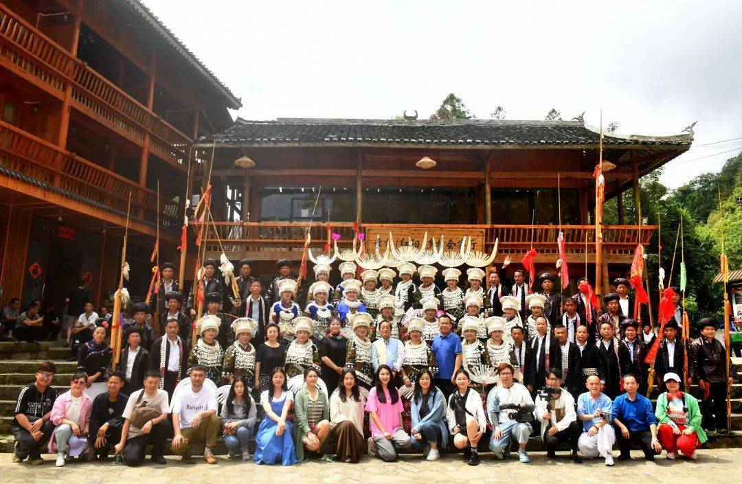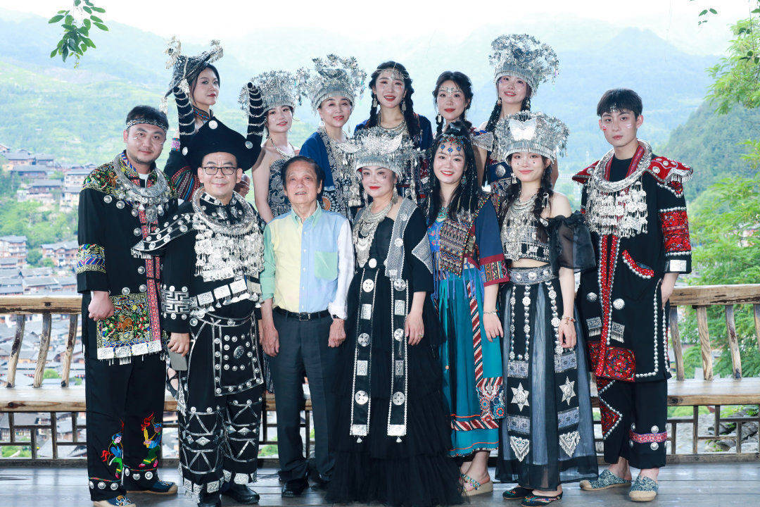 ▲韩美林周建萍夫妇(一排左三、左四)与身着苗族盛装的大篷车团队合影