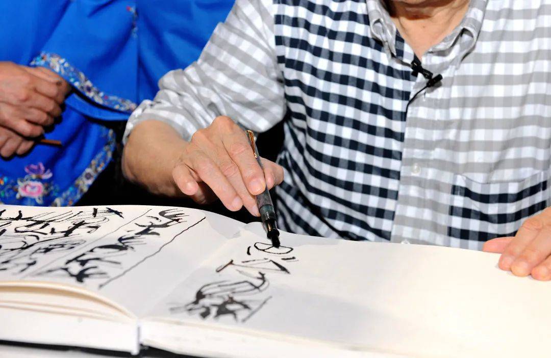 韩美林放下蜡刀,拿起画笔,在手稿本上接着画起天书手稿,边画边跟身旁的传承人解释线条、构图怎么能有当代艺术的感觉。最后随手拿起白纸撕了一个中间镂空的小书包样的纸片,盖在画好的天书手稿上,镂空部分立即将天书线条显现在书包的形状内,韩美林说:“这不就是文创布包,比传统纹样一点儿不差吧,肯定更受年轻人喜欢。”