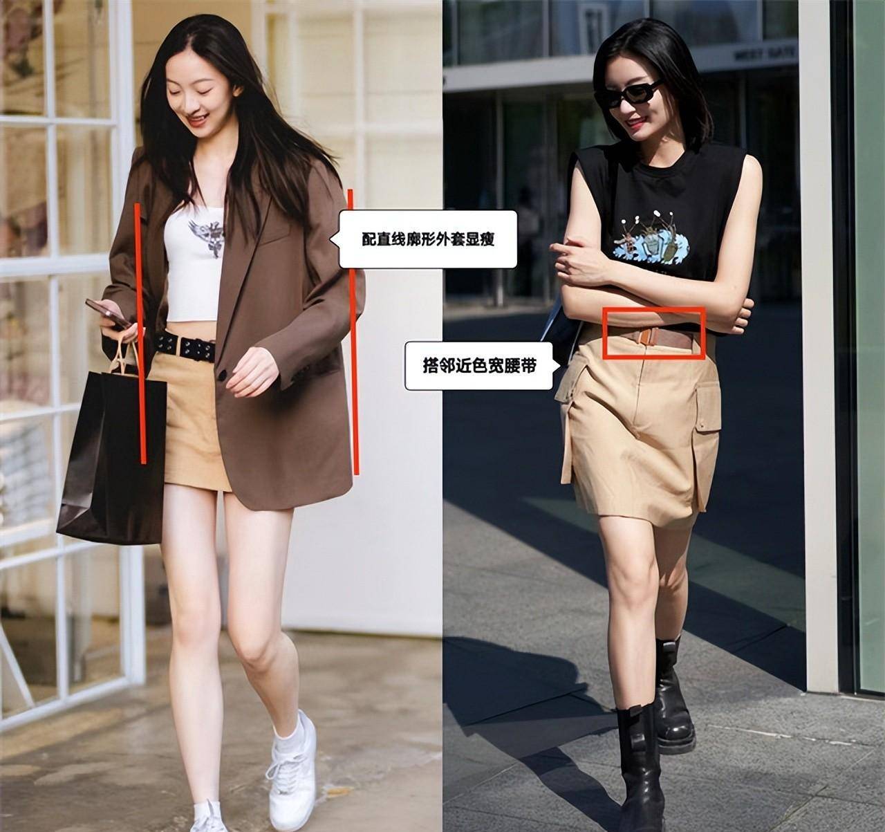 当然,这要靠廓形外套+宽腰带的双重配合。西装、牛仔外套等廓形笔直、面料挺括的外套最适合上半身结实的姐妹。相邻颜色的宽腰带可以防止运动裙因为太短而缺乏质感~