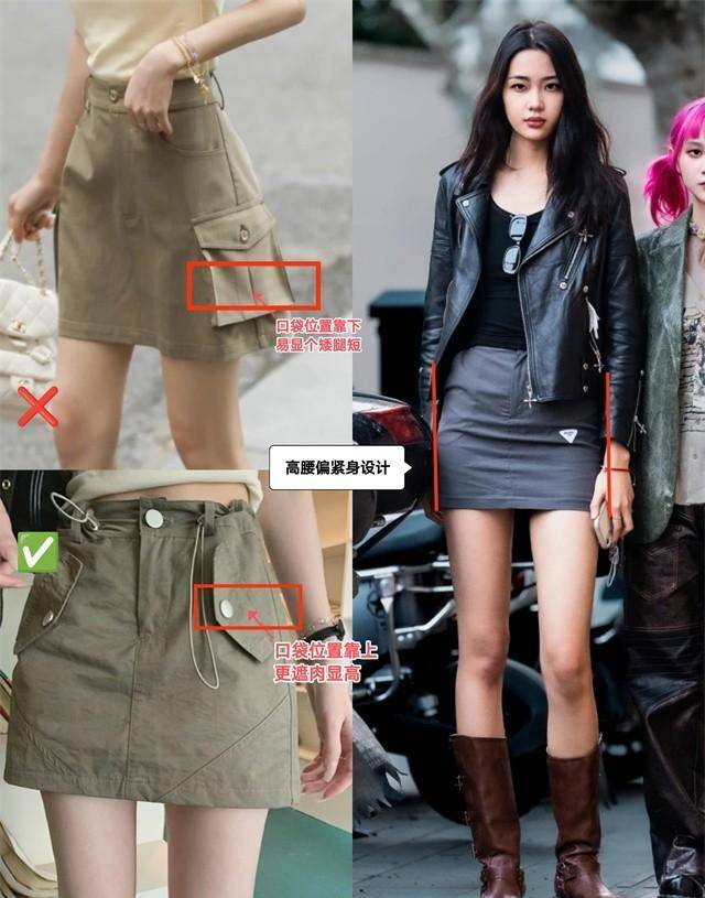 除了高腰设计,运动短裙还有一个加分元素:以口袋为代表的工装元素。这类元素应该放在腰部附近,遮住肉肉,显得更大。位置太低会显腿短~