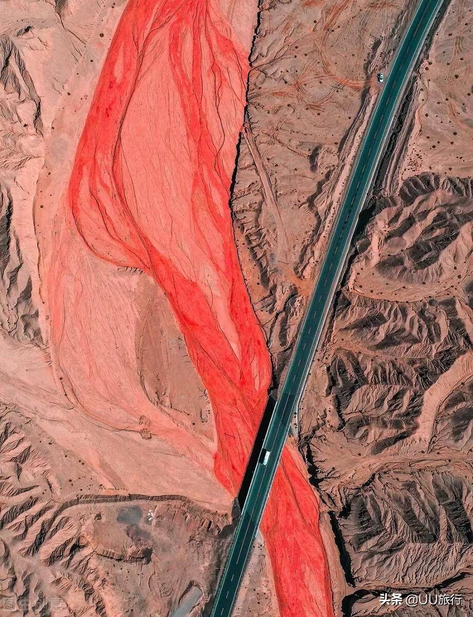 从大柴旦前往东台吉乃尔湖的这段必经之路,在757路碑处,一条干涸的河流穿过315国道,干枯的河床没有一滴水,呈现出于周围戈壁反差极大的红色,像是一条红色血脉流淌在荒漠之中,人们称其为大地之血,从航拍角度看,十分震撼。