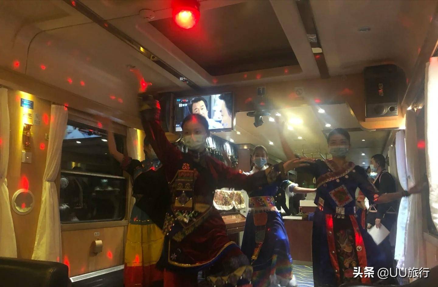 每晚九点以后的酒吧车厢,会有乘务员身穿云南少数民族服装在车厢内进行歌舞表演。平时也能用话筒在车厢内点歌唱歌。一路歌舞,窗外美景相伴,异常欢快。