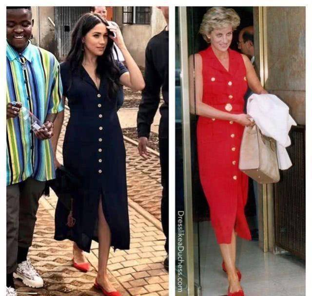也有眼尖的网友发现,梅根的这条裙子和戴安娜王妃在1994年时穿过的一条无袖红裙有异曲同工之妙,而且她们都搭配了红色平底鞋。梅根到达非洲后,已经穿过多双平底鞋,对自己的双脚很是宠爱,而戴妃则是身高优势过于明显,几乎不穿高跟鞋,尤其是和查尔斯王子在一起的时候。