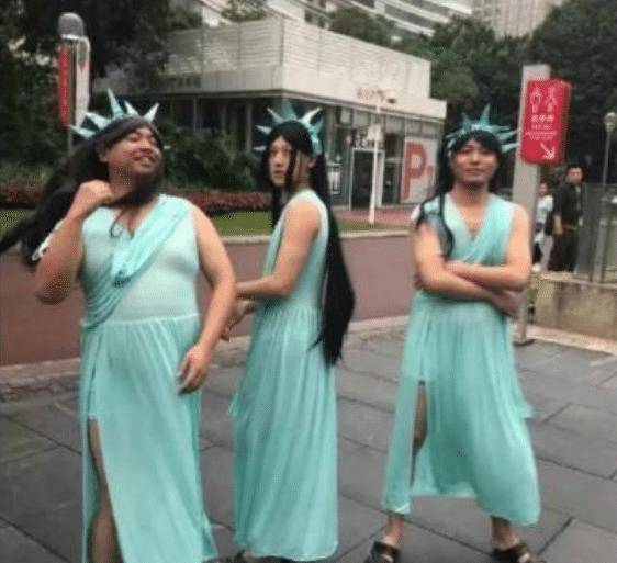 虽然都是男生,但中间那位穿裙子还是挺好看的。