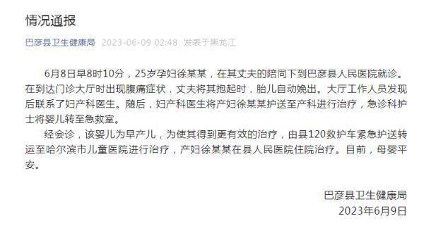 通报称,6月8日早8时10分,25岁孕妇徐某某,在其丈夫的陪同下到巴彦县人民医院就诊。在到达门诊大厅时出现腹痛症状,丈夫将其抱起时,胎儿自动娩出。大厅工作人员发现后联系了妇产科医生。随后,妇产科医生将产妇徐某某护送至产科进行治疗,急诊科护士将婴儿转至急救室。