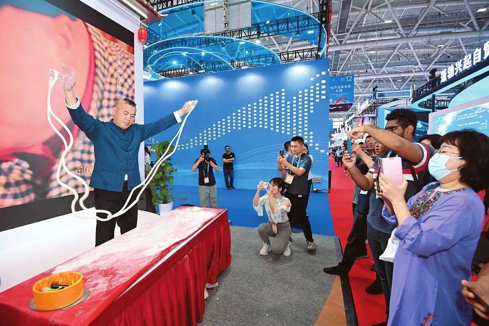 六月八日,深圳文博会我省展区内,面食绝活、剪纸、威风锣鼓等表演吸引了众多中外观展者驻足欣赏。本报记者阮洋摄