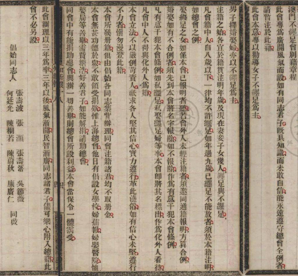 不仅在佛门之内,功德林大师们和当时的知识分子更积极在澳门推动废除妇女缠足的习俗,让她们在身、心皆得到“解放”。《知新报》第十九期曾刊登“澳门不缠足会章程”,提倡人之一正是观本法师(张寿波)。