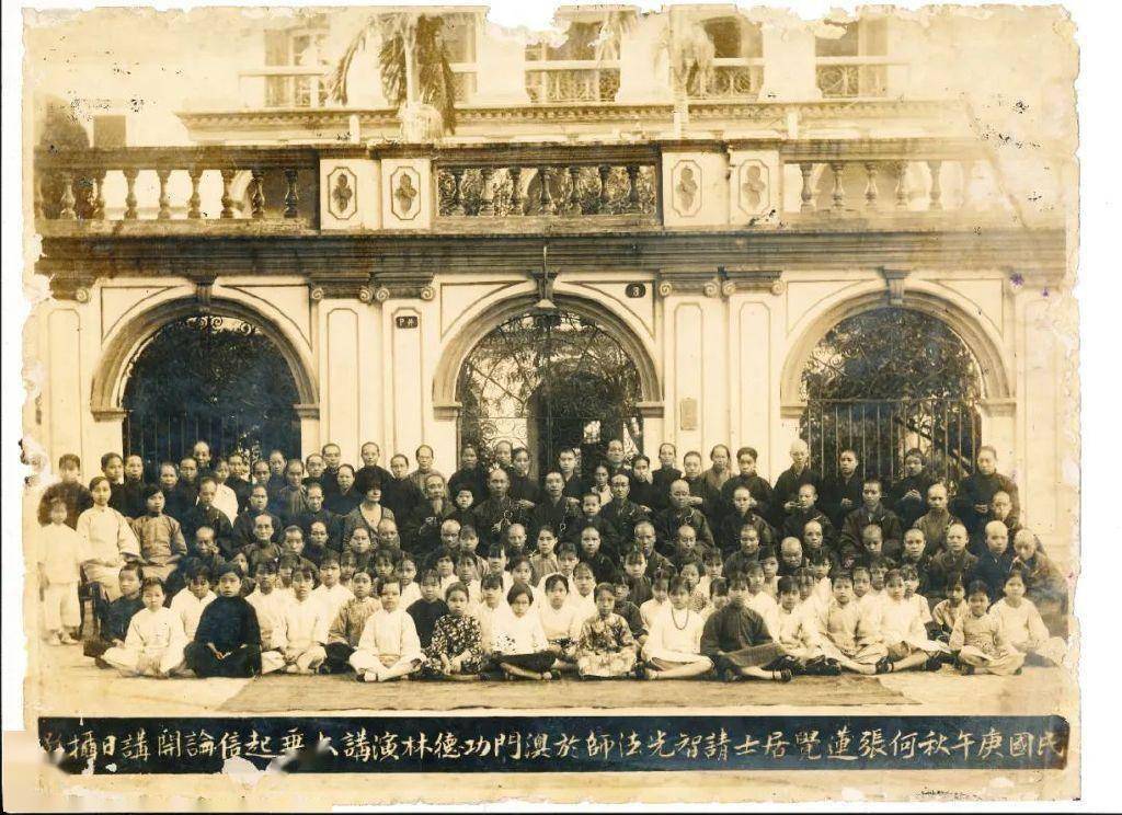 何东夫人(戴帽者)1930年请智光法师在功德林讲佛后,在其岗顶大宅(即今何东图书馆)前与学员合照。前排席地而坐的多为女子学员。
