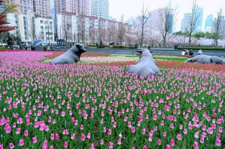 作为2023静安·新湖郁金香花博会的重要点位,这里可以感受郁金香花海与不同意趣的雕塑作品相映成趣、互相烘托的难得春景。