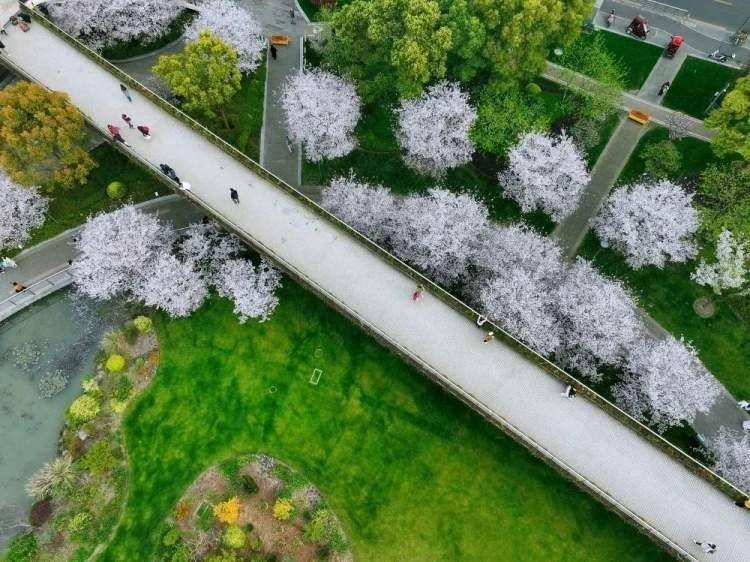 古诗有云:“花滴露,柳摇烟,艳阳天。雨霁山樱红欲烂,谷莺迁。”这段时间,偶有春雨,偶有艳阳,俯瞰静安中环公园,一簇簇、一排排樱花树点缀着春景,扮靓着城区。