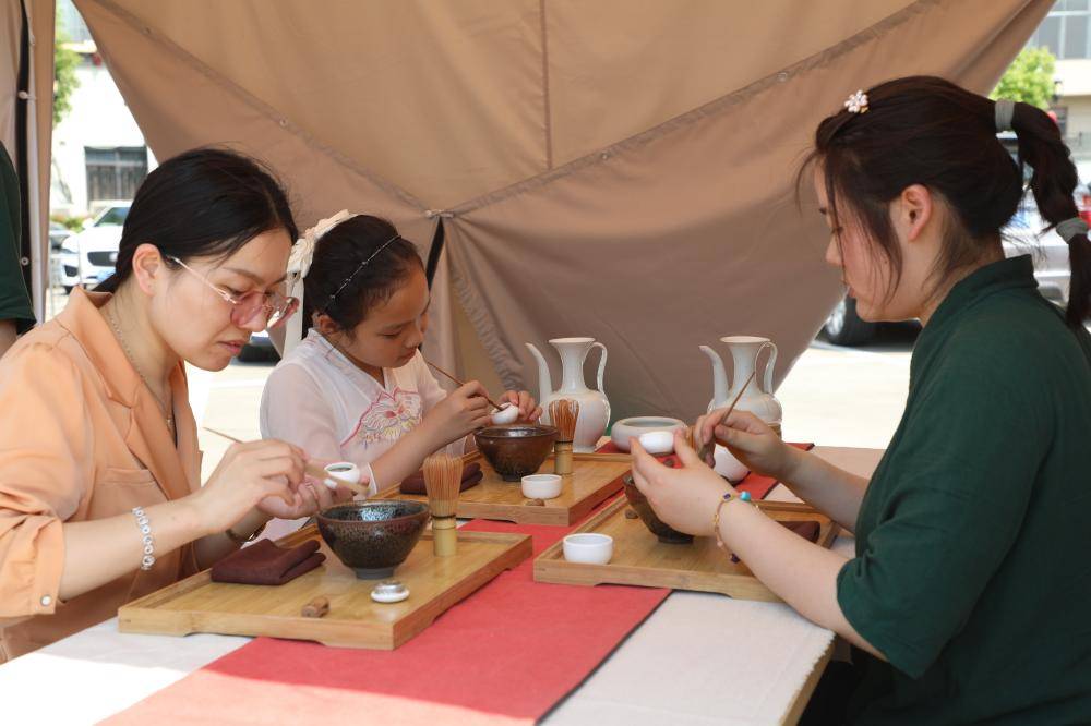 汉唐风韵、民国时代、民族风情……活动现场,市民游客沉浸于国风国潮中,开启非遗“心”体验。甲骨彩绘体验、酒酿咖啡制作体验、木船模型制作技艺体验、农民画长卷体验、刺绣体验、宋代点茶体验、拾遗韵非遗体验,各个主题摊位吸引人们争相参与,场面十分火爆。
