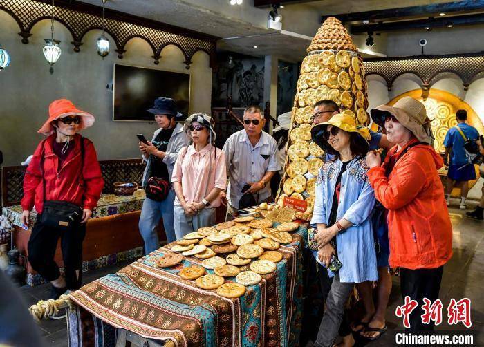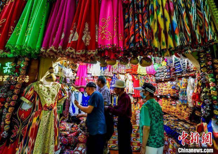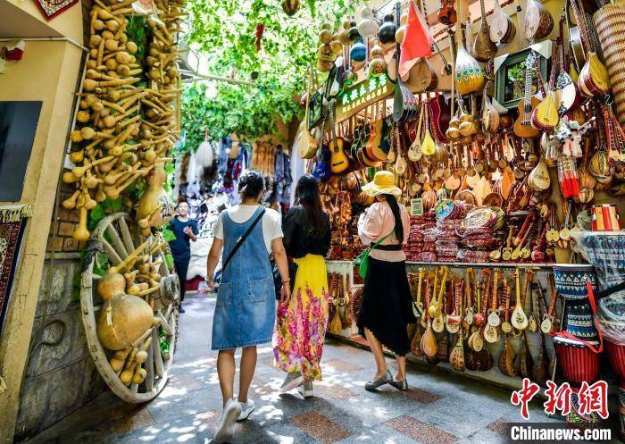 6月10日,新疆乌鲁木齐市国际大巴扎景区,来自各地的游客在景区内游览、观光、购物。进入6月,该市游客逐渐增多,国际大巴扎景区更是成为游客眼中的网红打卡地。盛夏季节,新疆各大景区旅游人数不断攀升,加之各地水果陆续上市,新疆迎来旅游旺季。