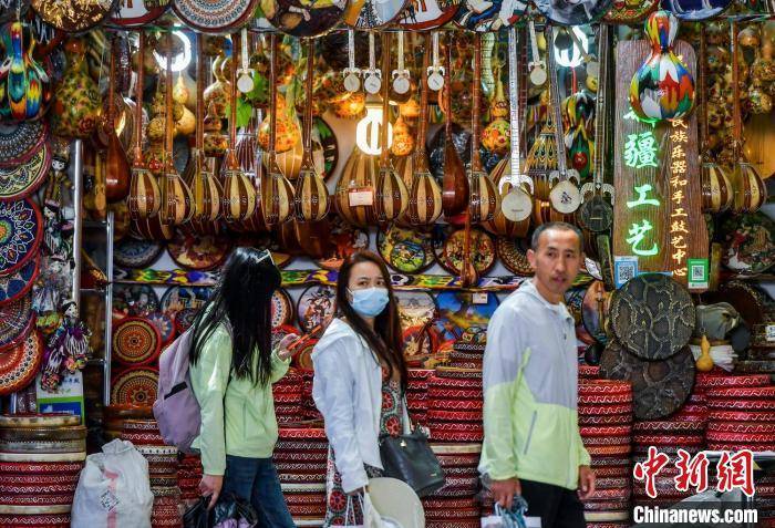 游客在满是新疆特色旅游商品的集市中游览。 刘新 摄